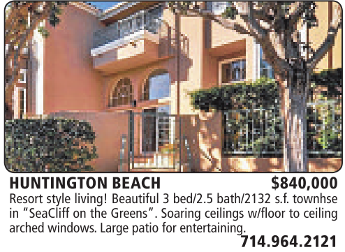 HUNTINGTON BEACH $840,000 Resort style living! Beautiful 3bed/2.5 bath/2132 s.f. townhse in “SeaCliff on the Greens”. Soaring ceilings w/floor to ceiling arched windows.Large patio for entertaining.