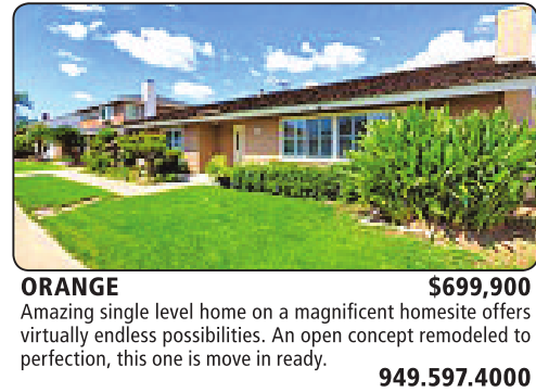 ORANGE $699,900 Amazing single level home onamagnificent homesite offers virtually endless possibilities. An open concept remodeled to perfection,this oneismove in ready. 949.597.4000
