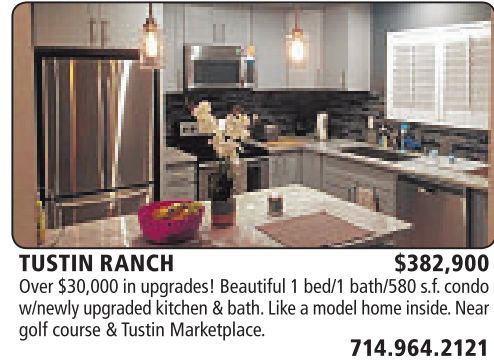 TUSTIN RANCH $382,900 Over $30,000inupgrades! Beautiful 1bed/1 bath/580s.f.condo w/newlyupgradedkitchen &bath. Likeamodel homeinside.Near golf course &TustinMarketplace.