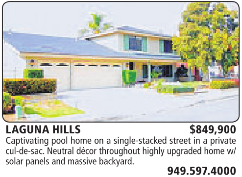 LAGUNA HILLS $849,900 Captivating pool home on asingle-stacked street in aprivate cul-de-sac. Neutral décor throughout highly upgraded home w/ solar panels and massive backyard.