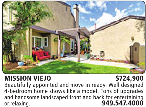 MISSION VIEJO $724,900 Beautifully appointed and move in ready. Well designed 4-bedroom home shows like a model. Tons of upgrades and handsome landscaped front and back for entertaining or relaxing. 949.547.4000