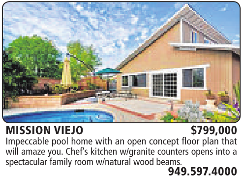 MISSION VIEJO $799,000 Impeccable pool home with an open concept floor plan that will amaze you. Chef’s kitchen w/granite counters opens into a spectacular family room w/naturalwood beams.