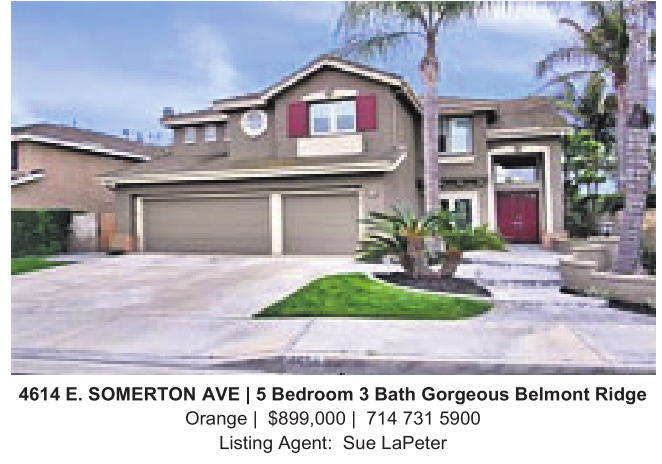 4614 E.SOMERTON AVE |5Bedroom 3Bath Gorgeous Belmont Ridge Orange | $899,000 | 714 731 5900 Listing Agent: Sue LaPeter