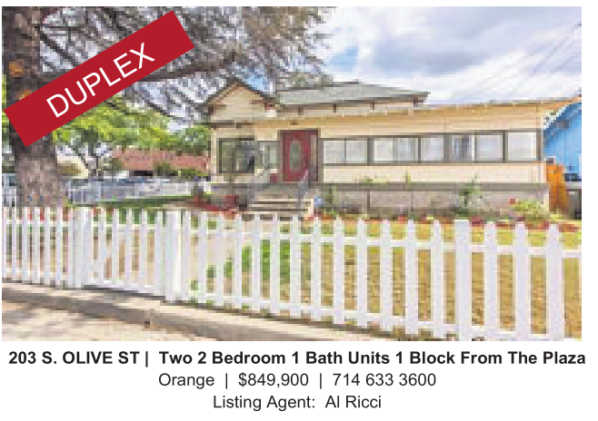 203 S. OLIVE ST| Two 2Bedroom 1Bath Units 1Block From The Plaza Orange | $849,900 | 714 633 3600 Listing Agent: AlRicci
