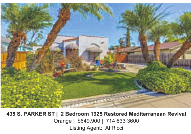 435 S. PARKER ST | 2 Bedroom 1925 Restored Mediterranean Revival Orange | $649,900 | 714 633 3600 Listing Agent: AlRicci