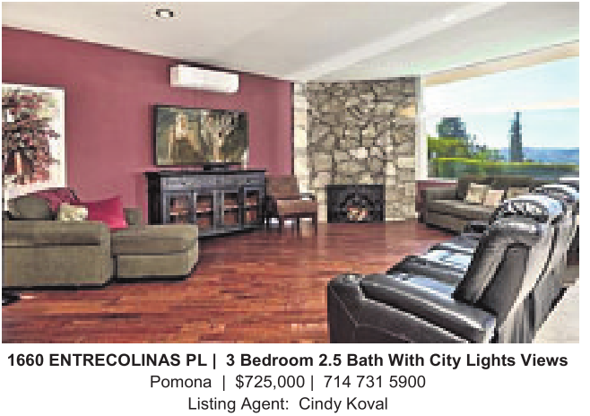 1660 ENTRECOLINAS PL| 3Bedroom 2.5 Bath With City Lights Views Pomona | $725,000 | 714 731 5900 Listing Agent: Cindy Koval