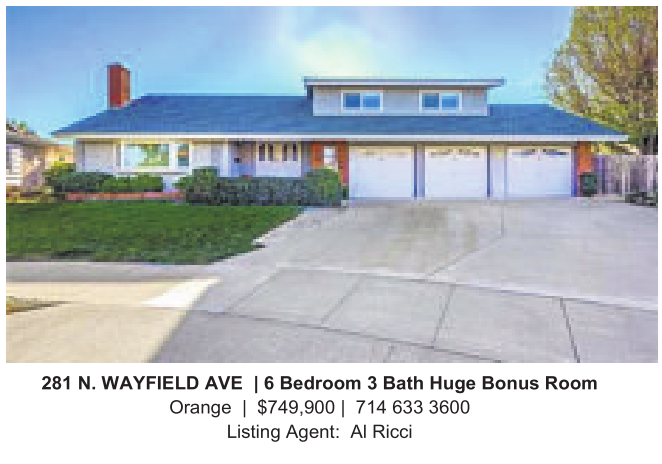 281 N. WAYFIELD AVE | 6Bedroom 3Bath Huge Bonus Room Orange | $749,900 | 714 633 3600 Listing Agent: AlRicci