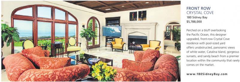 FRONT ROW CRYSTAL COVE 180 Sidney Bay $5,788,000 Perched on a bluff overlooking the Pacific Ocean, this designer upgraded, front-row Crystal Cove residence with pool-sized yard offers unobstructed, panoramic views of white water, Catalina Island, gorgeous sunsets, and sandy beach from a premier location within the community that rarely comes on the market. www.180SidneyBay.com