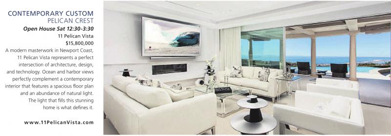 Open House Sat 12:30-3:30 11 Pelican Vista $15,800,000 A modern masterwork in Newport Coast, 11 Pelican Vista represents a perfect intersection of architecture, design, and technology. Ocean and harbor views perfectly complement a contemporary interior that features a spacious oor plan and an abundance of natural light.