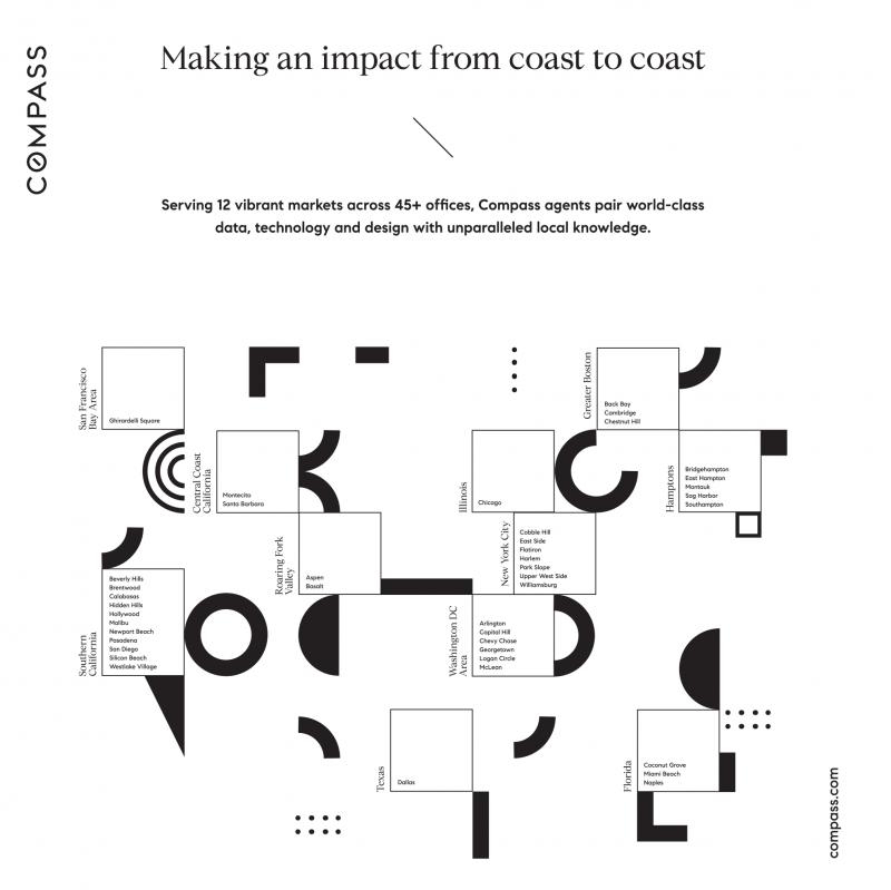 Making an impact from coast to coast Serving 12 vibrant markets across 45+ offices, Compass agents pair world-class data, technology and design with unparalleled local knowledge. Ghirardelli Square Beverly Hills Brentwood Calabasas Hidden Hills Hollywood Malibu Newport Beach Pasadena San Diego Silicon Beach Westlake Village Montecito Santa Barbara Aspen Basalt Dallas Chicago Arlington Capital Hill Chevy Chase Georgetown Logan Circle McLean Cobble Hill East Side Flatiron Harlem Park Slope Upper West Side Williamsburg Back Bay Cambridge Chestnut Hill Coconut Grove Miami Beach Naples Bridgehampton East Hampton Montauk Sag Harbor Southampton