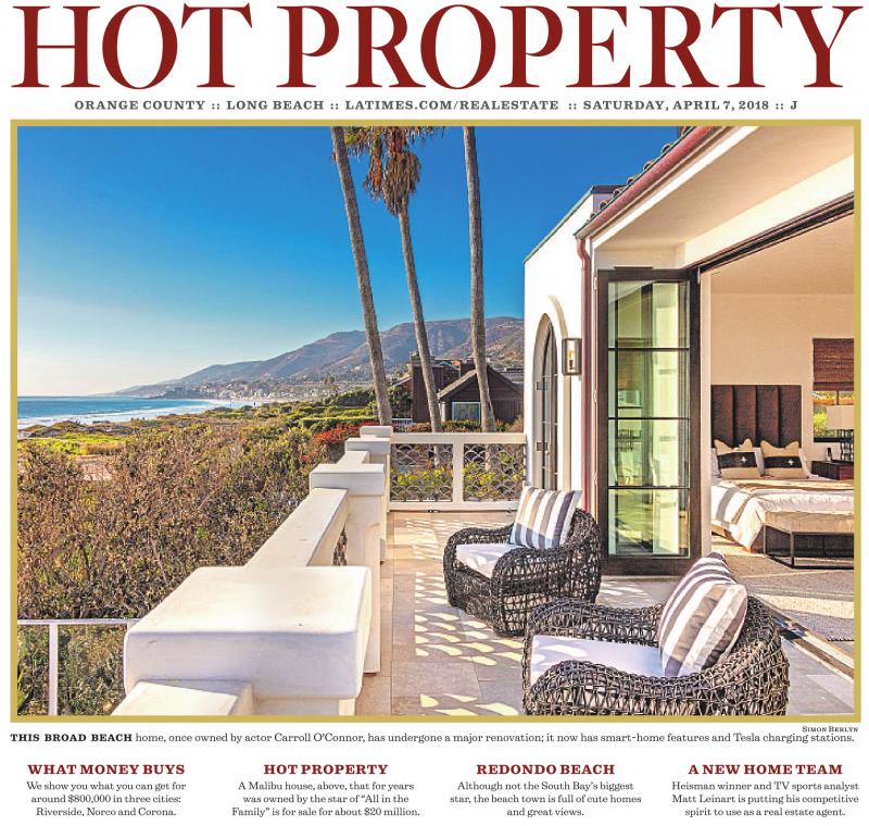 HOT PROPERT Y ORANGE COUNTY :: LONG BEACH :: LATIMES.COM/REALESTATE :: SATURDAY, APRIL 7, 2018 :: J Simon Berlyn THIS BROAD BEACH home, once owned by actor Carroll O'Connor, has undergone a major renovation; it now has smart-home features and Tesla charging stations. WHAT MONEY BUYS We show you what you can get for around $800,000 in three cities: Riverside, Norco and Corona. HOT PROPERTY A Malibu house, above, that for years was owned by the star of “All in the Family” is for sale for about $20 million. REDONDO BEACH Although not the South Bay’s biggest star, the beach town is full of cute homes and great views. A NEW HOME TEAM Heisman winner and TV sports analyst Matt Leinart is putting his competitive spirit to use as a real estate agent.