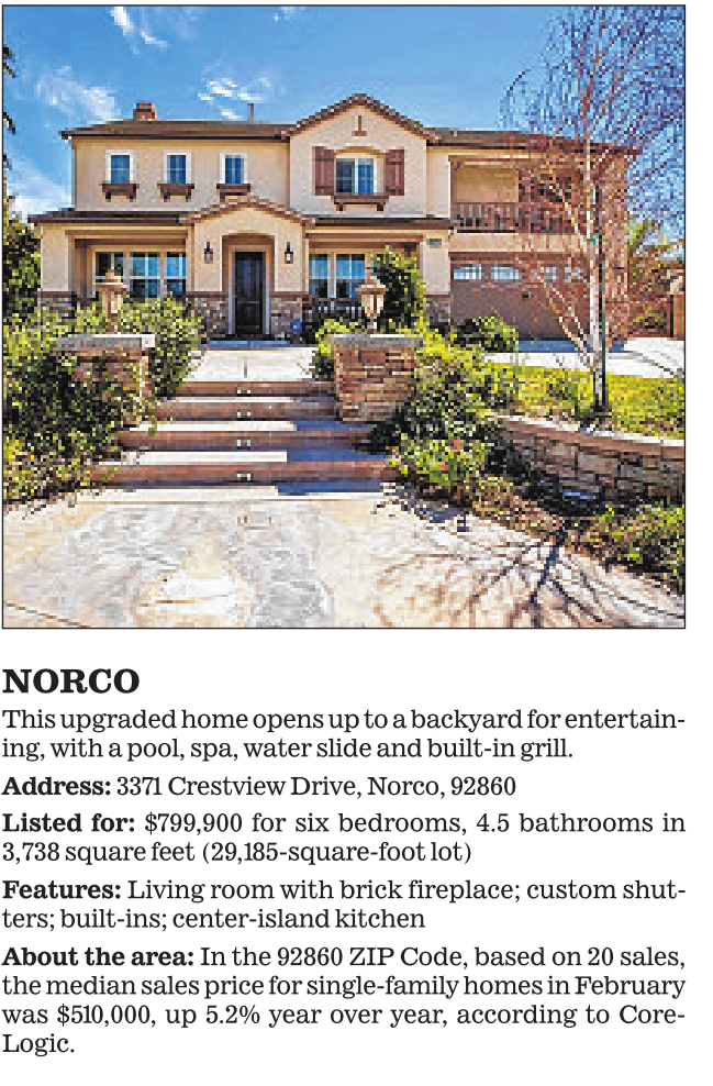 NORCO This upgraded home opens up to a backyard for entertaining, with a pool, spa, water slide and built-in grill. Address: 3371 Crestview Drive, Norco, 92860 Listed for: $799,900 for six bedrooms, 4.5 bathrooms in 3,738 square feet (29,185-square-foot lot) Features: Living room with brick fireplace; custom shutters; built-ins; center-island kitchen About the area: In the 92860 ZIP Code, based on 20 sales, the median sales price for single-family homes in February was $510,000, up 5.2% year over year, according to Core- Logic.