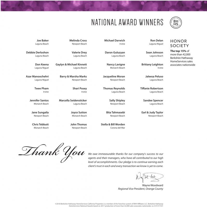 ©2018 BerkshireHathawayHomeServices California Properties is amember of the franchise system of BHH AffiliatesLLC.BerkshireHathaway HomeServices National Awards based on 2017 production of morethan 42,000 sales associatesnationwide.Lic #01317331
