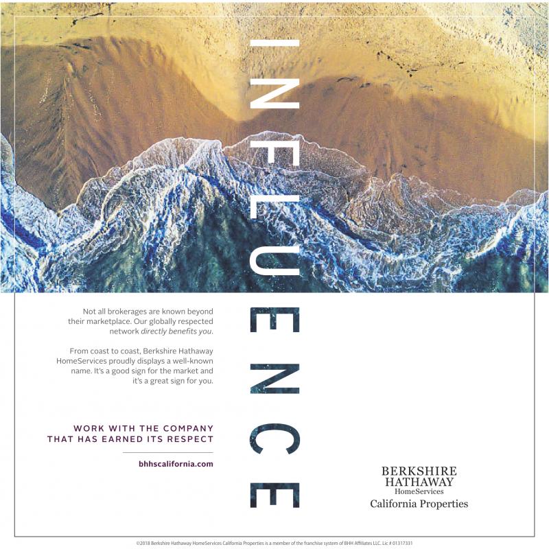 Not all brokerages are known beyond their marketplace. Our globally respected network directly benefits you. From coast to coast, Berkshire Hathaway HomeServices proudly displays a well-known name. It’s a good sign for the market and it’s a great sign for you. WORK WITH THE COMPANY THAT HAS EARNED ITS RESPECT bhhscalifornia.com ©2018 BerkshireHathawayHomeServices California Properties is amember of the franchise system of BHH AffiliatesLLC.Lic #01317331