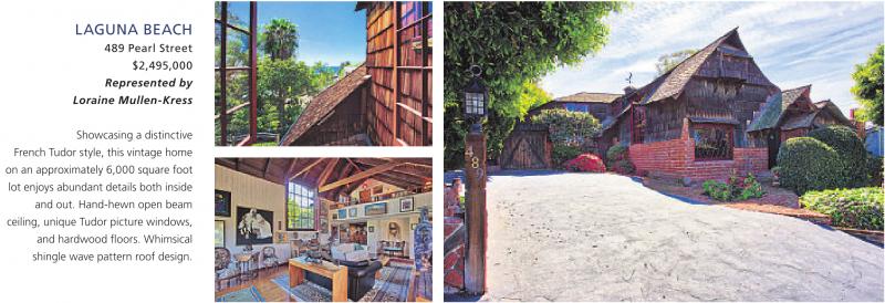 LAGUNA BEACH 489 Pearl Street $2,495,000 Represented by Loraine Mullen-Kress Showcasing a distinctive French Tudor style, this vintage home on an approximately 6,000 square foot lot enjoys abundant details both inside and out. Hand-hewn open beam ceiling, unique Tudor picture windows, and hardwood floors. Whimsical shingle wave pattern roof design. See also