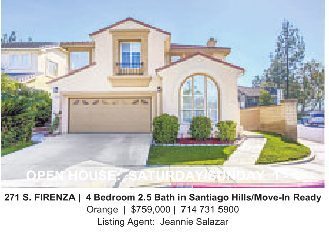 271 S.FIRENZA | 4Bedroom 2.5 Bath in Santiago Hills/Move-In Ready Orange | $759,000 | 714 731 5900 Listing Agent: Jeannie Salazar