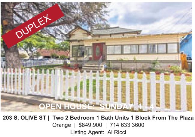 203 S. OLIVE ST| Two 2Bedroom 1Bath Units 1Block From The Plaza Orange | $849,900 | 714 633 3600 Listing Agent: AlRicci