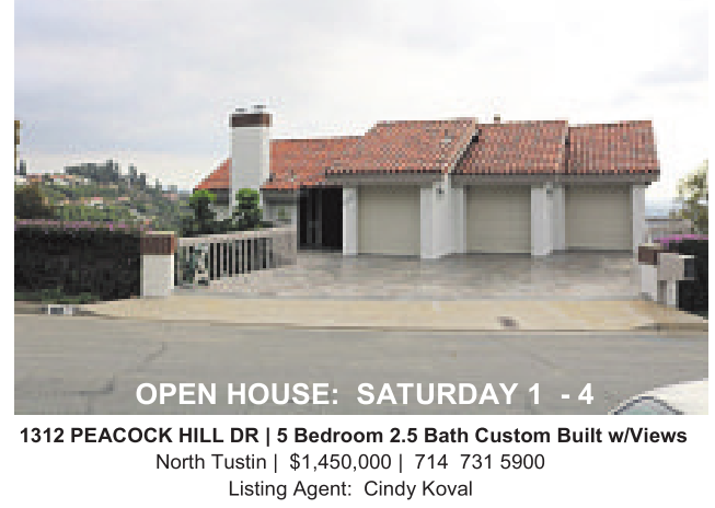 1312 PEACOCK HILL DR |5Bedroom 2.5 Bath Custom Built w/Views North Tustin | $1,450,000 | 714 731 5900 Listing Agent: Cindy Koval