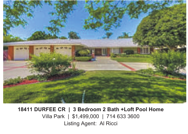 18411 DURFEE CR | 3 Bedroom 2Bath +Loft Pool Home Villa Park | $1,499,000 | 714 633 3600 Listing Agent: AlRicci