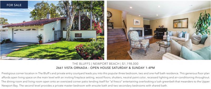 FOR SALE THE BLUFFS | NEWPORT BEACH | $1,198,000 2661 VISTA ORNADA : OPEN HOUSE SATURDAY & SUNDAY 1-4PM Prestigious corner location in The Bluff’s and private entry courtyard leads you into this popular three bedroom, two and one-half bath residence. This generous floor plan affords open living space on the main level with an inviting fireplace setting, wood floors, shutters, neutral paint color, recessed lighting and air-conditioning throughout. The dining room and living room open onto an oversized corner patio lending itself for “al fresco” entertaining overlooking a lush greenbelt that meanders to the Upper Newport Bay. The second level provides a private master bedroom with ensuite bath and two secondary bedrooms with shared bath.