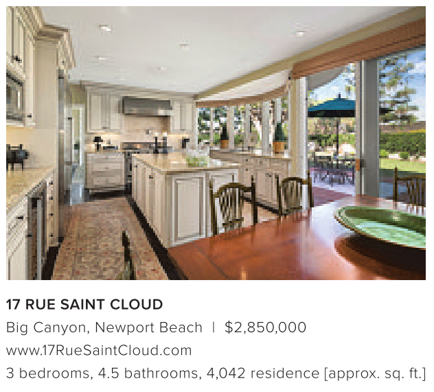 17 RUE SAINT CLOUD Big Canyon, Newport Beach | $2,850,000 www.17RueSaintCloud.com 3 bedrooms, 4.5 bathrooms, 4,042 residence [approx. sq. ft.]