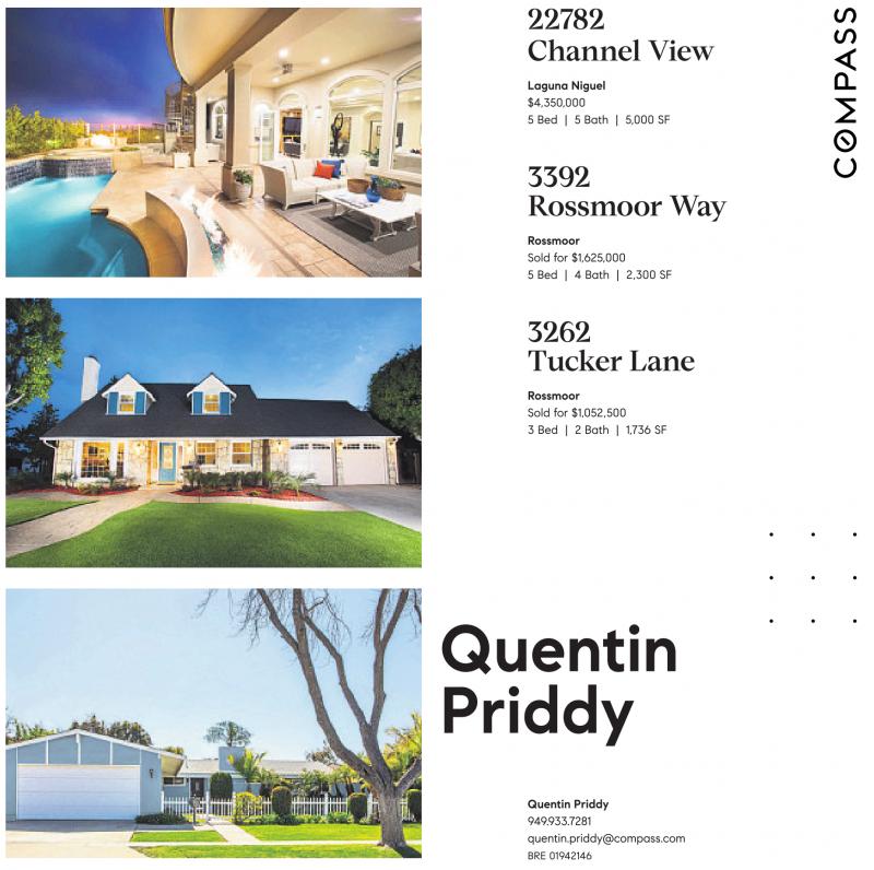 22782 Channel View Laguna Niguel $4,350,000 5 Bed | 5 Bath | 5,000 SF 3392 Rossmoor Way Rossmoor Sold for $1,625,000 5 Bed | 4 Bath | 2,300 SF 3262 Tucker Lane Rossmoor Sold for $1,052,500 3 Bed | 2 Bath | 1,736 SF Quentin Priddy Quentin Priddy 949.933.7281 quentin.priddy@compass.com BRE 01942146