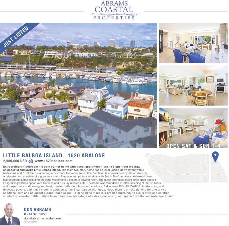 LITTLE BALBOA ISLAND | 1520 ABALONE 2,550,000 USD www.1520abalone.com Extraordinary 4 bedroom 4.5 bath corner home with guest apartment—just 44 steps from the Bay, on peaceful and idyllic Little Balboa Island. The main two-story home has an ideal upside-down layout with 3 bedrooms and 3 1/2 baths including a first floor bedroom suite. The 2nd level is approached by either stairway or elevator and consists of a great room with fireplace and picture window with South Bayfront views, deluxe kitchen, two bedroom suites including the large master and a separate powder room. The guest apartment has a large open-spaced living/dining/kitchen space with fireplace and a luxury master suite. The home was remodeled in 2016 including NEW: tile floors and carpet, air conditioning and heat, master bath, double paned windows, flat screen TV's, ELEVATOR, landscaping and driveway pavers, and much more! In addition to the 2-car garage with epoxy floor, there is on-site parking for one or two additional cars and abundant outdoor patio space. 1520 Abalone Place is a grand opportunity to live in style and carefree comfort on coveted Little Balboa Island and take advantage of extra income or guest space from the separate apartment. OPEN SAT & SUN 1-4 DON ABRAMS C 714.325.9055 don@abramscoastal.com BRE#01234323