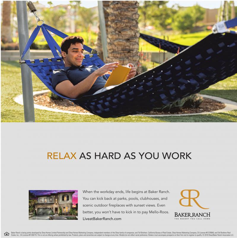 When the workday ends, life begins at Baker Ranch. You can kick back at parks, pools, clubhouses, and scenic outdoor fireplaces with sunset views. Even better, you won’t have to kick in to pay Mello-Roos. LiveatBakerRanch.com