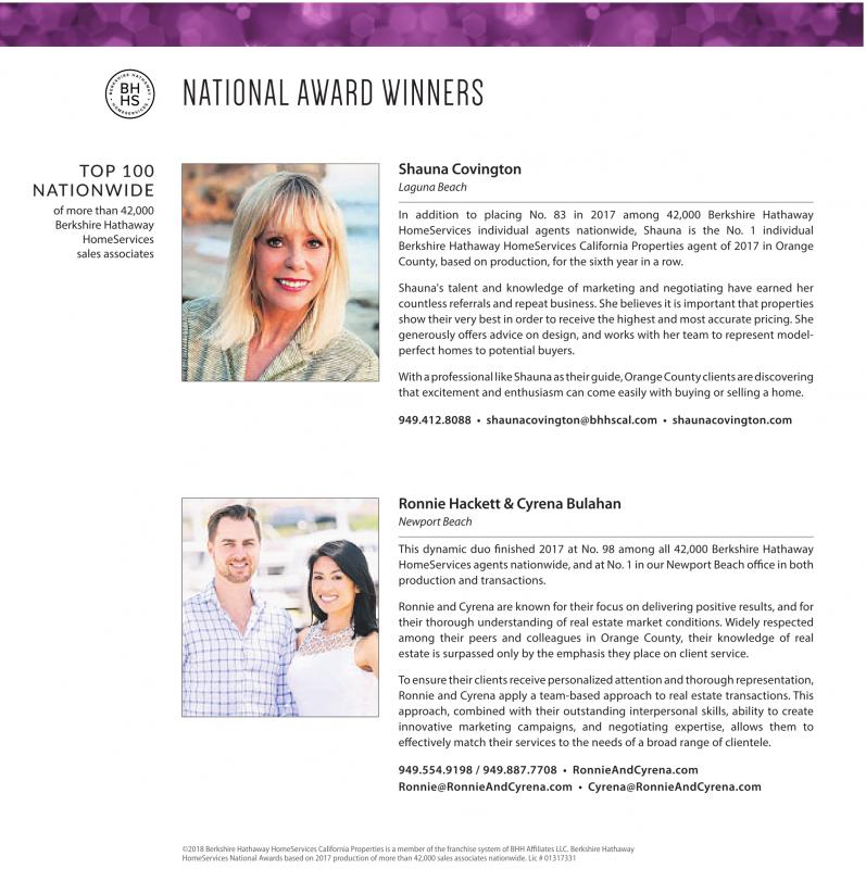 This dynamic duo finished 2017 at No. 98 among all 42,000 Berkshire Hathaway HomeServices agents nationwide,and at No.1inour NewportBeach office in both production and transactions.