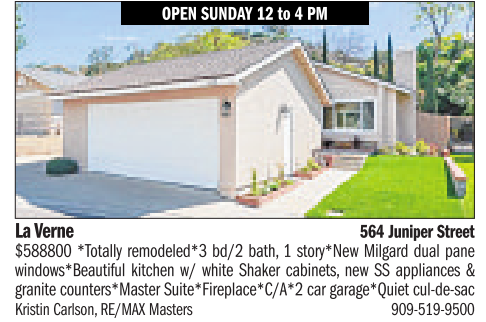 OPEN SUNDAY12to4PM La Verne 564Juniper Street $588800 *Totally remodeled*3 bd/2 bath, 1story*New Milgard dual pane windows*Beautiful kitchen w/ white Shaker cabinets, new SS appliances & granite counters*MasterSuite*Fireplace*C/A*2 car garage*Quiet cul-de-sac KristinCarlson, RE/MAXMasters 909-519-9500