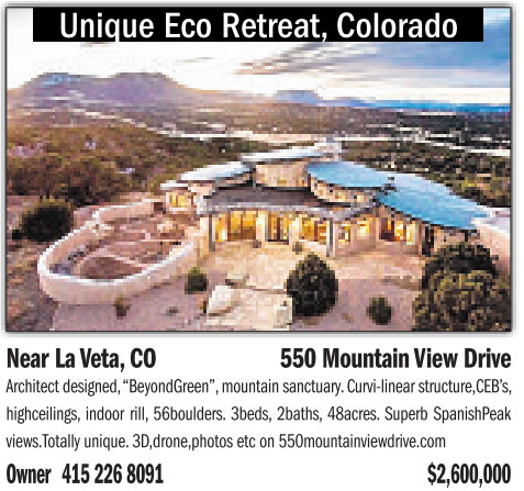 Architectdesigned,“BeyondGreen”, mountain sanctuary.Curvi-linearstructure,CEB’s, highceilings, indoor rill,56boulders.3beds, 2baths,48acres. Superb SpanishPeak views.Totally unique. 3D,drone,photos etc on 550mountainviewdrive.com