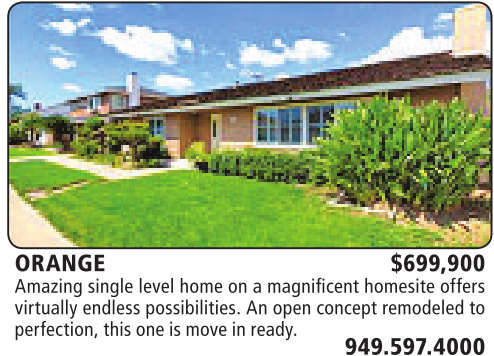 ORANGE $699,900 Amazing single level home onamagnificent homesite offers virtually endless possibilities. An open concept remodeled to perfection,this oneismove in ready. 949.597.4000