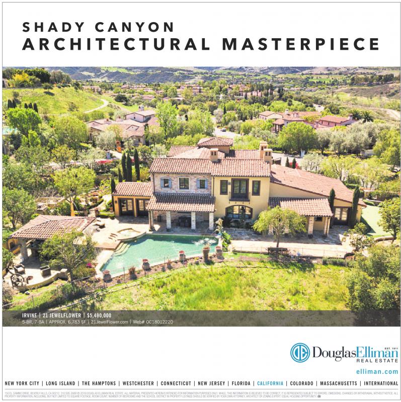 S H A D Y C A N Y O N A R C H I T E C T U R A L M A S T E R P I E C E IRVINE | 21 JEWELFLOWER | $5,490,000 5-BR, 7-BA | APPROX. 6,783 SF | 21JewelFlower.com | Web# OC18012220 elliman.com NEW YORK CITY | LONG ISLAND | THE HAMPTONS | WESTCHESTER | CONNECTICUT | NEW JERSEY | FLORIDA | CALIFORNIA | COLORADO | MASSACHUSETTS | INTERNATIONAL 150ELCAMINODRIVE,BEVERLY HILLS, CA 90212. 310.595.3888 ©2018DOUGLAS ELLIMAN REAL ESTATE. ALLMATERIAL PRESENTED HEREINISINTENDEDFOR INFORMATION PURPOSES ONLY.WHILE,THISINFORMATION IS BELIEVED TO BE CORRECT, IT IS REPRESENTED SUBJECTTOERRORS,OMISSIONS,CHANGESORWITHDRAWALWITHOUT NOTICE.ALL PROPERTY INFORMATION, INCLUDING, BUTNOT LIMITED TO SQUARE FOOTAGE, ROOM COUNT, NUMBER OF BEDROOMS ANDTHE SCHOOL DISTRICT IN PROPERTYLISTINGSSHOULD BE VERIFIEDBYYOUR OWNATTORNEY,ARCHITECT OR ZONINGEXPERT. EQUALHOUSING OPPORTUNITY.