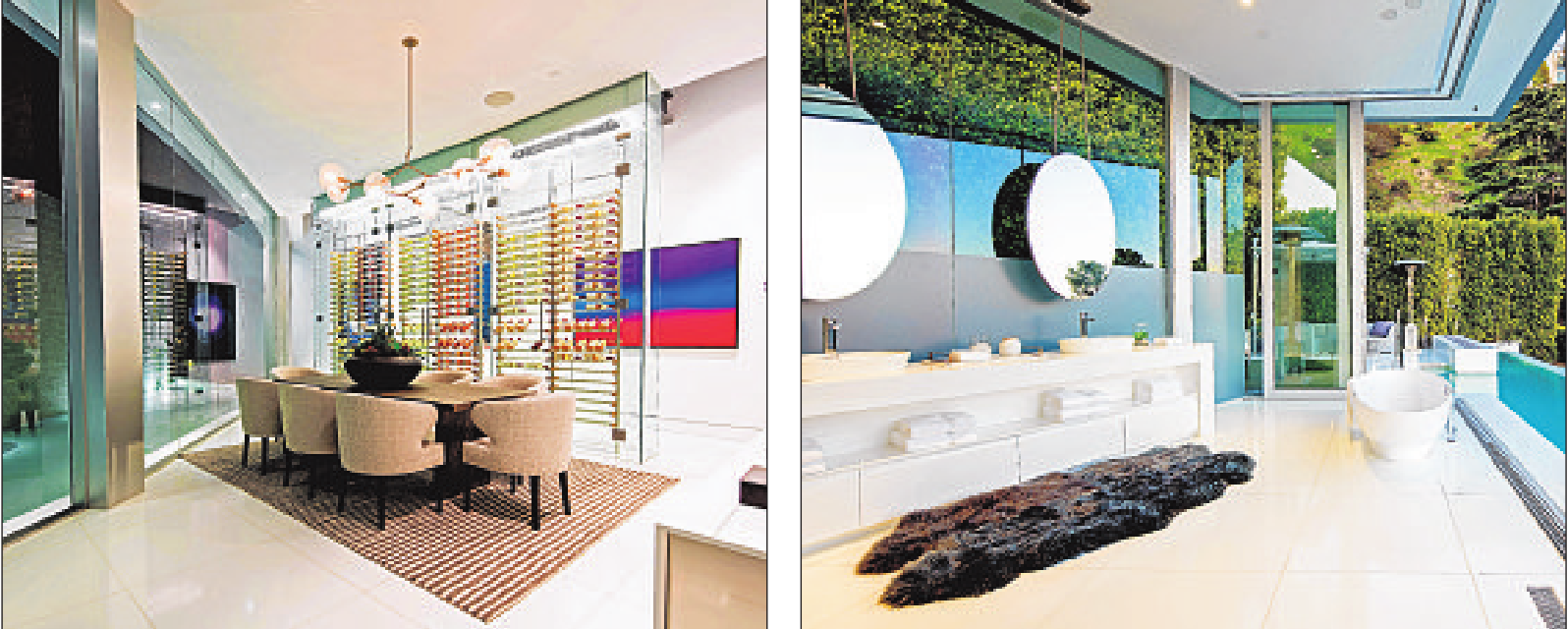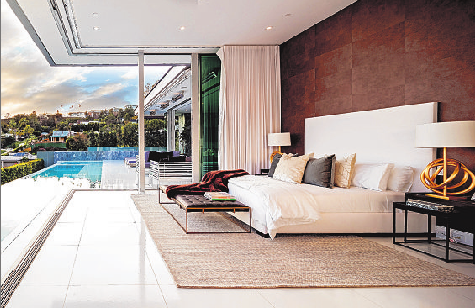 Inside, open-plan living areas showcase walls of floor-to-ceiling glass, slabs of marble and 12-foot ceilings for a clean, modern look. A 130-foot zero-edge swimming pool, which wraps the edge of the hillside property, blends with the skyline.