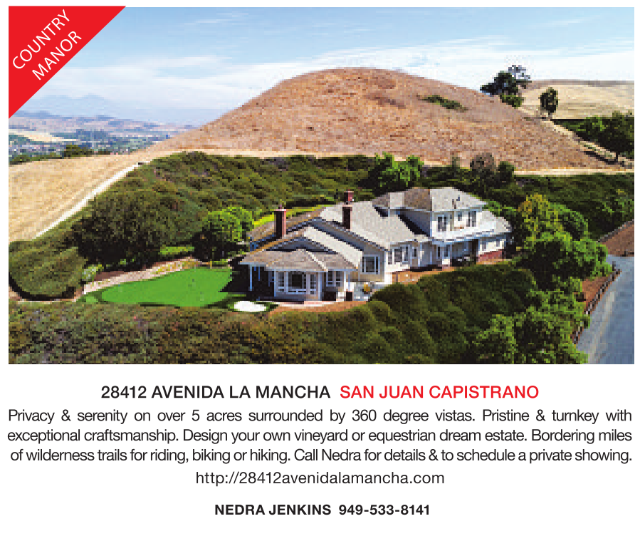 28412 AVENIDA LA MANCHA SAN JUAN CAPISTRANO Privacy & serenity on over 5 acres surrounded by 360 degree vistas. Pristine & turnkey with exceptionalcraftsmanship.Design your ownvineyardorequestriandream estate.Bordering miles of wilderness trails forriding, biking or hiking. Call Nedra fordetails &toscheduleaprivate showing.