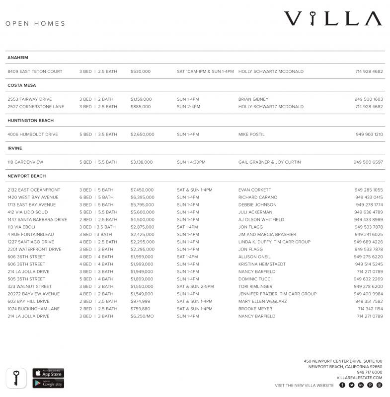 2132 EAST OCEANFRONT 3 BED | 5 BATH $7,450,000 SAT & SUN 1-4PM EVAN CORKETT 949 285 1055 1420 WEST BAY AVENUE 6 BED | 5 BATH $6,395,000 SUN 1-4PM RICHARD CARANO 949 433 0415 1713 EAST BAY AVENUE 3 BED | 5 BATH $5,795,000 SUN 1-4PM DEBBIE JOHNSON 949 278 1774 412 VIA LIDO SOUD 5 BED | 5.5 BATH $5,600,000 SUN 1-4PM JULI ACKERMAN 949 636 4789 1447 SANTA BARBARA DRIVE 2 BED | 2.5 BATH $4,500,000 SUN 1-4PM AJ OLSON WHITFIELD 949 433 8989 113 VIA EBOLI 3 BED | 3.5 BATH $2,875,000 SAT 1-4PM JON FLAGG 949 533 7878 4 RUE FONTAINBLEAU 3 BED | 3 BATH $2,425,000 SUN 1-4PM JIM AND MARCIA BRASHIER 949 241 6025 1227 SANTIAGO DRIVE 4 BED | 2.5 BATH $2,295,000 SUN 1-4PM LINDA K. DUFFY, TIM CARR GROUP 949 689 4226 2201 WATERFRONT DRIVE 3 BED | 3 BATH $2,295,000 SUN 1-4PM JON FLAGG 949 533 7878 606 36TH STREET 4 BED | 4 BATH $1,999,000 SAT 1-4PM ALLISON ONEIL 949 275 6220 606 36TH STREET 4 BED | 4 BATH $1,999,000 SUN 1-4PM KRISTINA HEIMSTAEDT 949 514 5245 214 LA JOLLA DRIVE 3 BED | 3 BATH $1,949,000 SUN 1-4PM NANCY BARFIELD 714 271 0789 505 35TH STREET 5 BED | 4 BATH $1,899,000 SUN 1-4PM DOMINIC TUCCI 949 632 2269 323 WALNUT STREET 3 BED | 2 BATH $1,550,000 SAT & SUN 2-5PM TORI RIMLINGER 949 378 6200 20272 BAYVIEW AVENUE 4 BED | 2 BATH $1,549,000 SUN 1-4PM JENNIFER FRAZIER, TIM CARR GROUP 949 400 9984 603 BAY HILL DRIVE 2 BED | 2.5 BATH $974,999 SAT & SUN 1-4PM MARY ELLEN WEGLARZ 949 351 7582 1074 BUCKINGHAM LANE 2 BED | 2.5 BATH $759,880 SAT & SUN 1-4PM BROOKE MEYER 714 342 1194 214 LA JOLLA DRIVE 3 BED | 3 BATH $6,250/MO SUN 1-4PM NANCY BARFIELD 714 271 0789