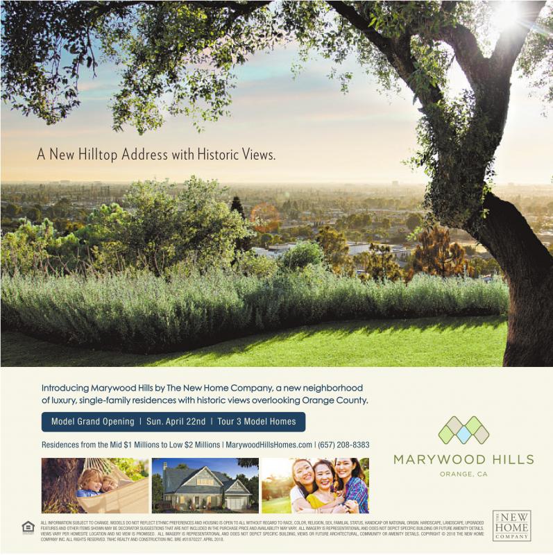 A New Hilltop Address with Historic Views. Introducing Marywood Hills by The New Home Company, a new neighborhood of luxury, single-family residences with historic views overlooking Orange County. Model Grand Opening | Sun. April 22nd | Tour 3 Model Homes Residences from the Mid $1 Millions to Low $2 Millions | MarywoodHillsHomes.com | (657) 208-8383 ALL INFORMATION SUBJECT TO CHANGE. MODELS DO NOT REFLECT ETHNIC PREFERENCES AND HOUSING IS OPEN TO ALL WITHOUT REGARD TO RACE, COLOR, RELIGION, SEX, FAMILIAL STATUS, HANDICAP OR NATIONAL ORIGIN. HARDSCAPE, LANDSCAPE, UPGRADED FEATURES AND OTHER ITEMS SHOWN MAYBEDECORATOR SUGGESTIONS THATARE NOT INCLUDED IN THE PURCHASE PRICE AND AVAILABILITY MAYVARY. ALL IMAGERYISREPRESENTATIONAL AND DOES NOT DEPICT SPECIFIC BUILDING OR FUTURE AMENITY DETAILS. VIEWS VARY PER HOMESITE LOCATION AND NO VIEW IS PROMISED. ALL IMAGERY ISREPRESENTATIONAL AND DOES NOT DEPICT SPECIFIC BUILDING, VIEWS OR FUTURE ARCHITECTURAL, COMMUNITY OR AMENITY DETAILS. COPYRIGHT ©2018 THE NEW HOME COMPANY INC. ALL RIGHTS RESERVED. TNHC REALTY AND CONSTRUCTION INC. BRE #01870227. APRIL 2018.