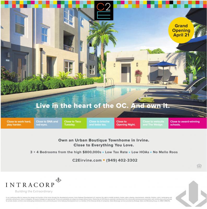 In our continuing effort to improve the design and function of the home through the development process, Irvine Gateway Development LLC reserves the right to modify locations, homes, plans, phasing, improvements, materials, finishes, colors, landscaping and amenities without prior notice or obligation. All square footages are approximate.Prices and availability are subject to change without notice.Ownership at C2E features automatic membership in the community homeowner(s) association with monthly dues which provide for private streets, common area landscaping maintenance and acommunity pool. Irvine Gateway Development LLC isamember ofthe Intracorp family of companies. Sales Brokerage services provided by Strategic Sales and Marketing Group, Inc. BRE# 01862116.