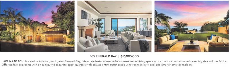 LAGUNA BEACH: Located in 24 hour guard gated Emerald Bay, this estate features over 6,800 square feet of living space with expansive unobstructed sweeping views of the Pacific. Offering five bedrooms with en suites, two separate guest quarters with private entry, 1,000 bottle wine room, infinity pool and Smart Home technology.