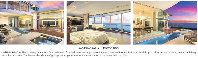 LAGUNA BEACH: This stunning home with four bedrooms, five bedrooms and 4,500-acre Laguna Coast Wilderness Park as its backdrop, it offers access to hiking, mountain biking and other activities. The home’s abundance of glass provides panoramic white water views of the ocean and coastline.