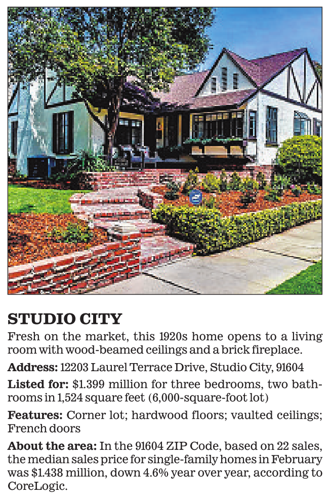 STUDIO CITY Fresh on the market, this 1920s home opens to a living room with wood-beamed ceilings and a brick fireplace. Address: 12203 Laurel Terrace Drive, Studio City, 91604 Listed for: $1.399 million for three bedrooms, two bathrooms in 1,524 square feet (6,000-square-foot lot) Features: Corner lot; hardwood floors; vaulted ceilings; French doors About the area: In the 91604 ZIP Code, based on 22 sales, the median sales price for single-family homes in February was $1.438 million, down 4.6% year over year, according to CoreLogic.