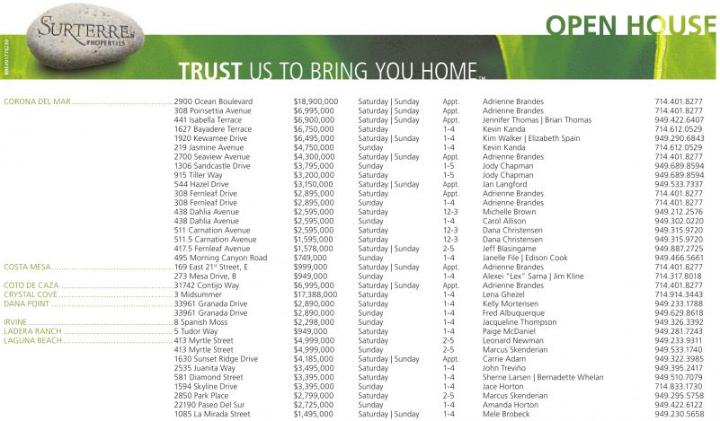 CORONA DEL MAR.........................................2900 Ocean Boulevard $18,900,000 Saturday | Sunday Appt. Adrienne Brandes 714.401.8277 308 Poinsettia Avenue $6,995,000 Saturday | Sunday Appt. Adrienne Brandes 714.401.8277 441 Isabella Terrace $6,900,000 Saturday | Sunday Appt. Jennifer Thomas | Brian Thomas 949.422.6407 1627 Bayadere Terrace $6,750,000 Saturday 1-4 Kevin Kanda 714.612.0529 1920 Kewamee Drive $6,495,000 Saturday | Sunday 1-4 Kim Walker | Elizabeth Spain 949.290.6843 219 Jasmine Avenue $4,750,000 Sunday 1-4 Kevin Kanda 714.612.0529 2700 Seaview Avenue $4,300,000 Saturday | Sunday Appt. Adrienne Brandes 714.401.8277 1306 Sandcastle Drive $3,795,000 Sunday 1-5 Jody Chapman 949.689.8594 915 Tiller Way $3,200,000 Saturday 1-5 Jody Chapman 949.689.8594 544 Hazel Drive $3,150,000 Saturday | Sunday Appt. Jan Langford 949.533.7337 308 Fernleaf Drive $2,895,000 Saturday Appt. Adrienne Brandes 714.401.8277 308 Fernleaf Drive $2,895,000 Sunday 1-4 Adrienne Brandes 714.401.8277 438 Dahlia Avenue $2,595,000 Saturday 12-3 Michelle Brown 949.212.2576 438 Dahlia Avenue $2,595,000 Sunday 1-4 Carol Allison 949.302.0220 511 Carnation Avenue $2,595,000 Saturday 12-3 Dana Christensen 949.315.9720 511.5 Carnation Avenue $1,595,000 Saturday 12-3 Dana Christensen 949.315.9720 417.5 Fernleaf Avenue $1,578,000 Saturday | Sunday 2-5 Jeff Blasingame 949.887.2725 495 Morning Canyon Road $749,000 Sunday 1-4 Janelle File | Edison Cook 949.466.5661 COSTA MESA.................................................169 East 21 st Street, E $999,000 Saturday | Sunday Appt. Adrienne Brandes 714.401.8277 273 Mesa Drive, B $949,000 Sunday 1-4 Alexei “Lex” Sarna | Jim Kline 714.317.8018 COTO DE CAZA .............................................31742 Contijo Way $6,995,000 Saturday | Sunday Appt. Adrienne Brandes 714.401.8277 CRYSTAL COVE ..............................................3 Midsummer $17,388,000 Saturday 1-4 Lena Ghezel 714.914.3443 DANA POINT .................................................33961 Granada Drive $2,890,000 Saturday 1-4 Kelly Mortensen 949.233.1788 33961 Granada Drive $2,890,000 Sunday 1-4 Fred Albuquerque 949.629.8618 IRVINE ..........................................................8 Spanish Moss $2,298,000 Sunday 1-4 Jacqueline Thompson 949.326.3392 LADERA RANCH ............................................5 Tudor Way $949,000 Saturday 1-4 Paige McDaniel 949.281.7243 LAGUNA BEACH ............................................413 Myrtle Street $4,999,000 Saturday 2-5 Leonard Newman 949.233.9311 413 Myrtle Street $4,999,000 Sunday 2-5 Marcus Skenderian 949.533.1740 1630 Sunset Ridge Drive $4,185,000 Saturday | Sunday Appt. Carrie Adam 949.322.3985 2535 Juanita Way $3,495,000 Saturday 1-4 John Treviño 949.395.2417 581 Diamond Street $3,395,000 Saturday 1-4 Sherrie Larsen | Bernadette Whelan 949.510.7079 1594 Skyline Drive $3,395,000 Sunday 1-4 Jace Horton 714.833.1730 2850 Park Place $2,799,000 Saturday 2-5 Marcus Skenderian 949.295.5758 22190 Paseo Del Sur $2,725,000 Sunday 1-4 Amanda Horton 949.422.6122 1085 La Mirada Street $1,495,000 Saturday | Sunday 1-4 Mele Brobeck 949.230.5658