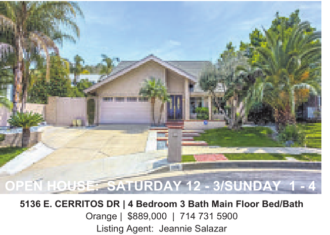 5136 E.CERRITOS DR |4Bedroom 3Bath Main Floor Bed/Bath Orange | $889,000 | 714 731 5900 Listing Agent: Jeannie Salazar