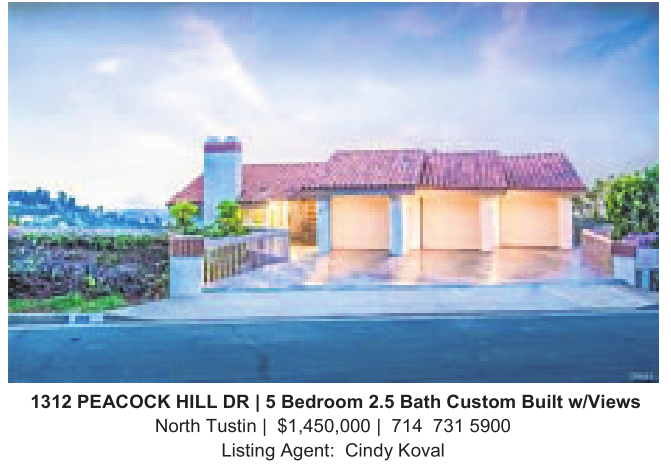 1312 PEACOCK HILL DR |5Bedroom 2.5 Bath Custom Built w/Views North Tustin | $1,450,000 | 714 731 5900 Listing Agent: Cindy Koval
