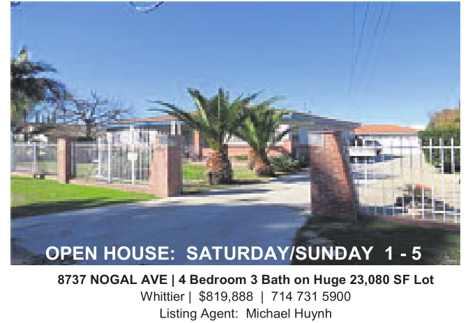 8737 NOGAL AVE |4Bedroom 3Bath onHuge 23,080 SFLot Whittier | $819,888 | 714 731 5900 Listing Agent: Michael Huynh