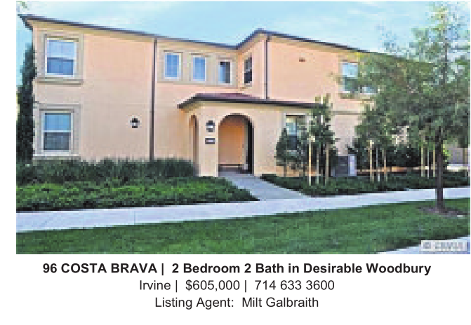 96 COSTA BRAVA | 2 Bedroom 2Bath inDesirable Woodbury Irvine | $605,000 | 714 633 3600 Listing Agent: Milt Galbraith