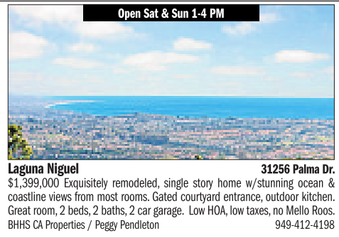 $1,399,000 Exquisitely remodeled, single story home w/stunning ocean & coastline views from most rooms. Gated courtyard entrance, outdoor kitchen. Great room, 2beds,2baths, 2car garage. Low HOA, low taxes,noMello Roos. BHHS CA Properties /PeggyPendleton 949-412-4198
