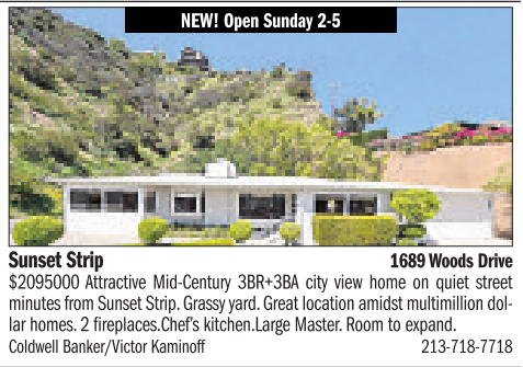 Sunset Strip 1689 Woods Drive $2095000 Attractive Mid-Century 3BR+3BA city view home on quiet street minutesfrom Sunset Strip.Grassy yard.Great location amidst multimillion dollar homes. 2 fireplaces.Chef’s kitchen.Large Master.Roomtoexpand.