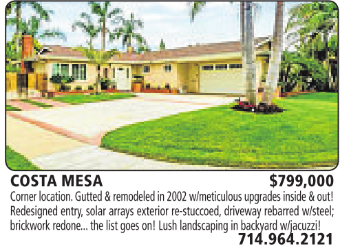 COSTA MESA $799,000 Corner location. Gutted &remodeledin2002 w/meticulousupgrades inside &out! Redesigned entry,solar arrays exterior re-stuccoed, driveway rebarred w/steel; brickworkredone... the list goes on! Lush landscaping in backyard w/jacuzzi!