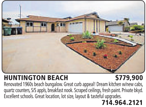 HUNTINGTON BEACH $779,900 Renovated 1960s beach bungalow.Great curbappeal! Dream kitchen w/new cabs, quartzcounters,S/S appls,breakfast nook. Scraped ceilings,fresh paint. Private bkyd. Excellent schools.Great location, lot size,layout &tasteful upgrades.